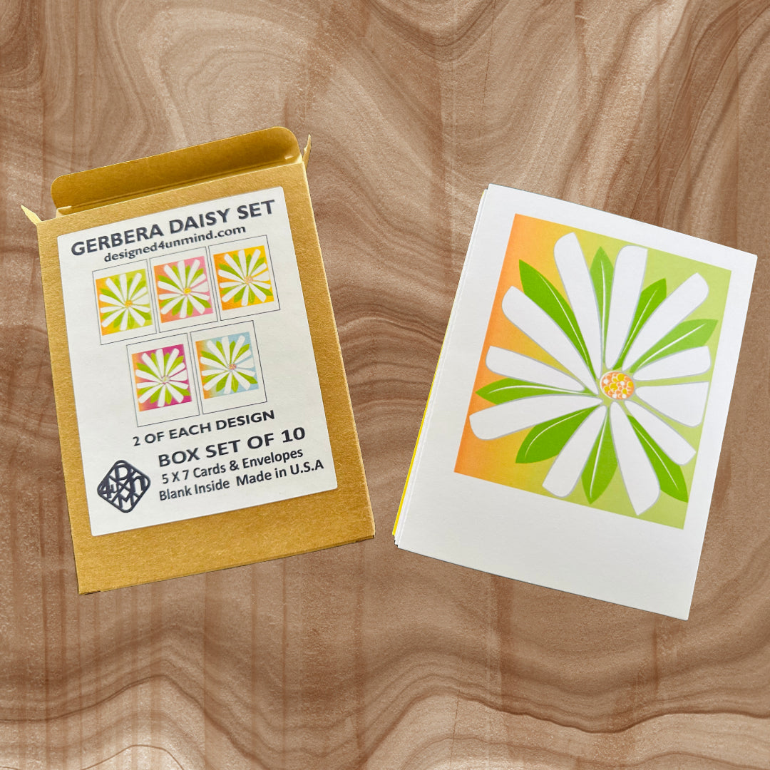 GERBENA DAISY FLOWER MULTI COLORED CARDS - BOX SET OF 10. Designed with a Mid-Century Modern esthetic with bold graphic influence of the florals of the 60's -70's